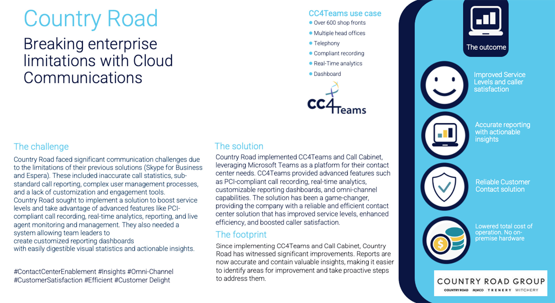 The decision to choose and roll out CC4Teams and Call Cabinet was made after a detailed analysis of Country Road’s communication requirements. The solution has been a game-changer, providing the company with a reliable and efficient contact center solution that has improved service levels, enhanced efficiency, and boosted caller satisfaction.